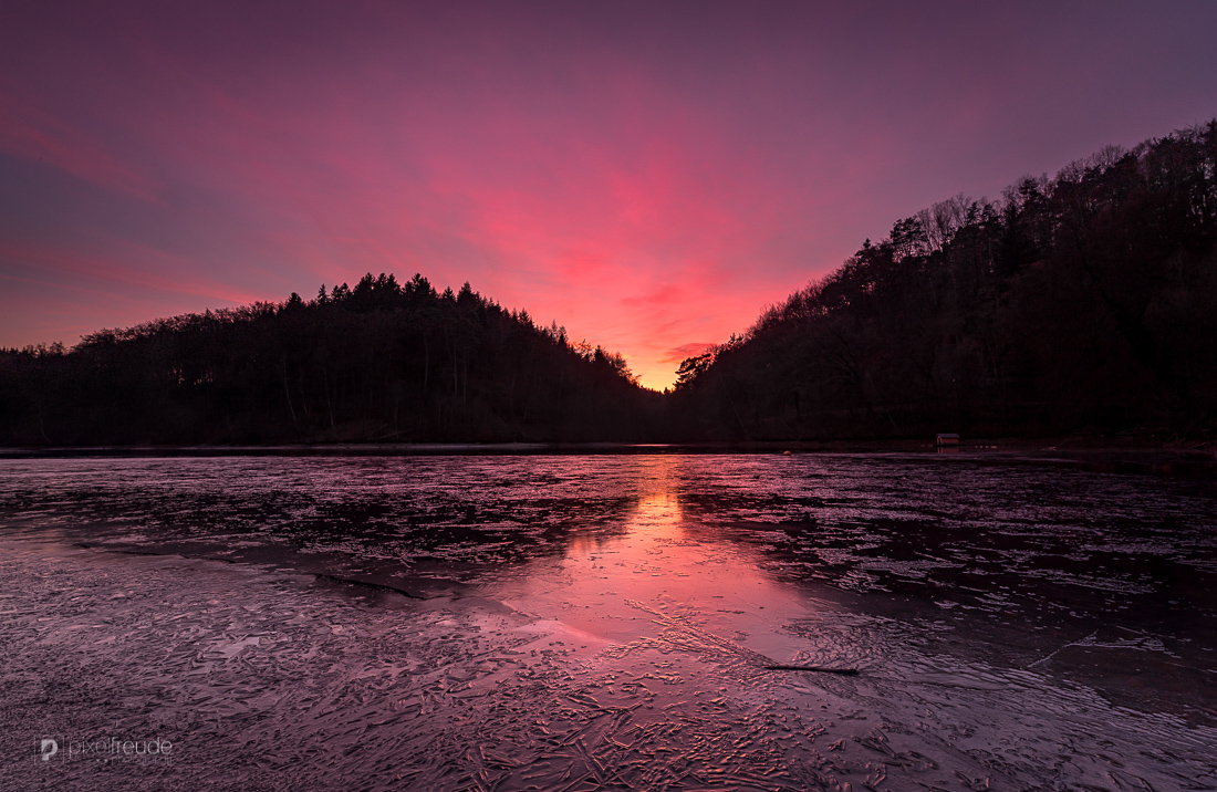 Dieser farbenprächtige Sonnenuntergang hat die fast schon geschlossene Eisfläche auf dem Eiswoog letzte Woche wunderbar angeleuchtet.