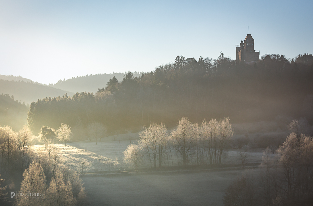 Die Burg Berwartstein an einem Morgen im Januar. Wie in einem Märchen thront die Burg über der eiskalten Landschaft.
