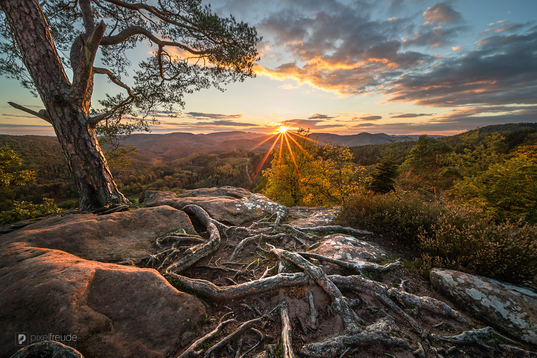 farbenfernblickfleckensteinherbstkieferkrappenfelspfalzpfälzerpfälzerwaldsonnenstrahlensonnenuntergangsüdpfalzurlaubwetterkieferwurzeln