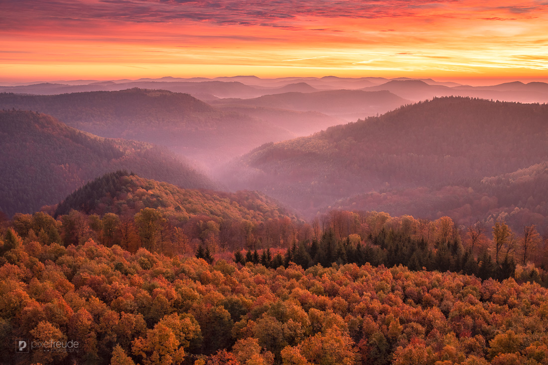 Am vergangenen Dienstag gab es ein unglaublich intensives Morgenrot über der Pfalz. Zusammen mit den bunt gefärbten Bäumen ein unfassbarer Moment.